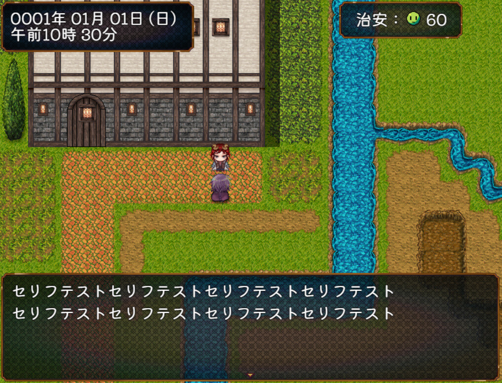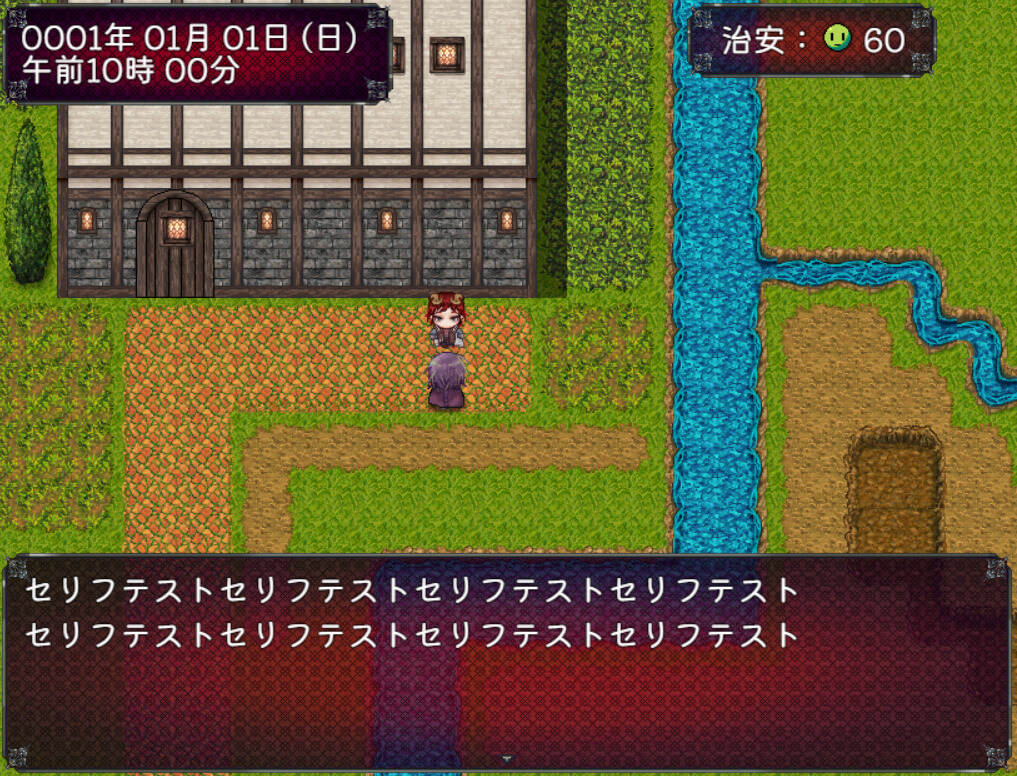 進捗001 2026/01/01 制作記録 現在制作中のゲームのスクショです。とりあえず治安システムのベースを完成させました。治安システムが何かって?戦いから逃げ続けたり治安を下げる行動をとると地域ごとに設定された治安が減少します。治安が悪いと商人が寄り付かなくなったり、馬車(ファストトラベル)が使用不可になったり、ネズミが発生したりします。夜になると一時的に更に治安値が悪化し、地域に仲間を配置することで治安の悪化を防いだりもできます。もちろん、敵を倒しまくると治安が良くなります。面白そうですね(圧)。 シミュレーションゲームが好きなので、自作RPGもシミュレーション要素をたくさん導入したいです。あと1枚目の画像は全て自作のイラストを使用しています。出来る限り全ての素材を自作でまかなうつもりです。完成までに何年かかるか見ものですね。